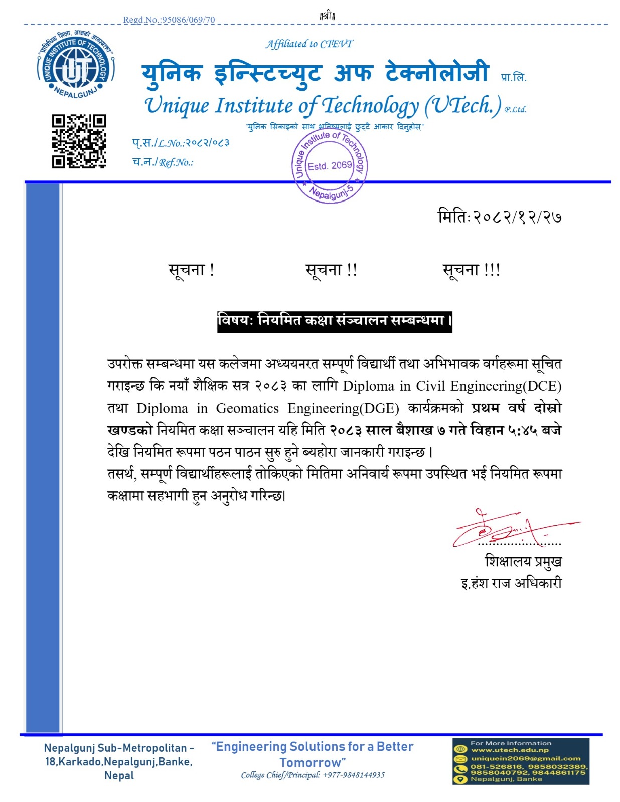 This is to inform all the students that the regular classes for Diploma in Civil Engineering (DCE) & Diploma in Geomatics Engineering(DGE) – 2nd Semes...